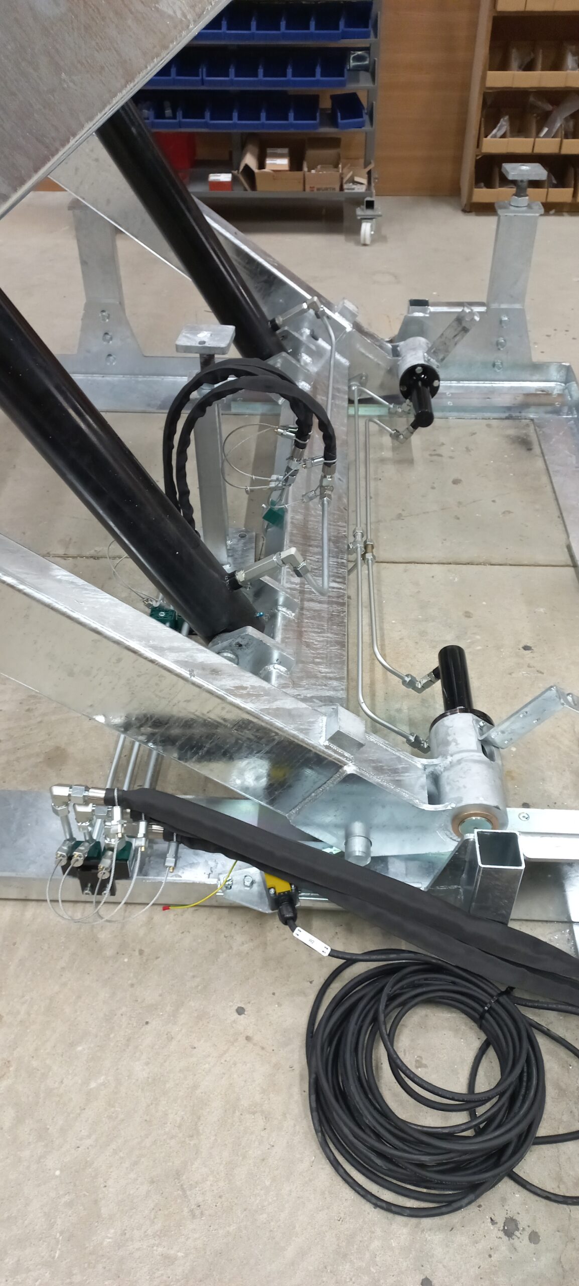 Parmi nos réalisations, une solution intègre une table élévatrice équipée d’un plateau rotatif 360° à pilotage hydraulique.